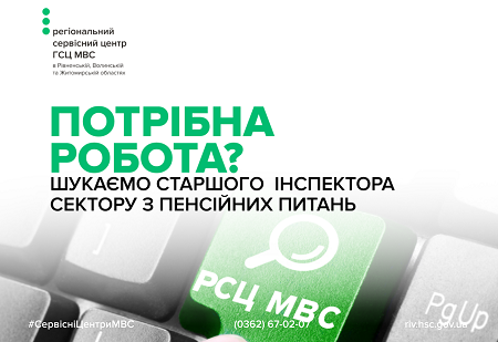 Сервісні центри МВС продовжують формувати професійну та відповідальну команду державних службовців і запрошує кандидатів долучитися до роботи на посаді старшого інспектора сектору з пенсійних питань з обслуговування Рівненської області (м. Рівне) регіонального сервісного центру ГСЦ МВС в Рівненській, Волинській та Житомирській областях (філія ГСЦ). Це можливість реалізувати свій професійний потенціал у сфері пенсійного забезпечення та зробити вагомий внесок у соціальний захист ветеранів.   Посадові обов’язки: обслуговування пенсіонерів, колишніх осіб рядового і начальницького складу органів внутрішніх справ, військовослужбовців Національної гвардії України, внутрішніх військ МВС, членів їхніх сімей  з питань призначення (перерахунку) пенсії, встановлення статусу ветерана органів внутрішніх справ, виготовлення довідок про право на пільги, призначення одноразової грошової допомоги; виготовлення грошового атестату, розрахунку вислуги років, довідок про розмір грошового забезпечення звільненим зі служби військовослужбовцям, особам рядового і начальницького складу органів внутрішніх справ в межах наділених повноважень; підготовка та подання відзивів, апеляційних та касаційних скарг, своєчасне виконання судових рішень, які набрали законної сили; розгляд звернень громадян, звернень органів державної влади, запитів народних депутатів України, запитів адвокатів з питань, що належать до компетенції Сектору. Вимоги вища освіта. вільне володіння державною мовою. Перевагою буде знання законодавства щодо пенсійного забезпечення військовослужбовців, осіб рядового і начальницького складу органів МВС; вища юридична освіта, робота в електронному суді; навички роботи з нормативно правовими документами, уважність. Ми гарантуємо Офіційне працевлаштування. Стабільну та своєчасну виплату заробітної плати. Відпустки та соціальні пільги згідно із законодавством. Нормований робочий графік. Резюме приймаємо до 15 березня 2026 року на адресу hr_riv@hsc.gov.ua Робота в системі МВС - це не лише стабільність та соціальні гарантії, а й можливість бути частиною команди, яка забезпечує соціальний захист та справедливість для тих, хто присвятив своє життя службі державі. Запрошуємо відповідальних, компетентних і вмотивованих фахівців приєднатися до нашої команди та розвиватися разом із нами.