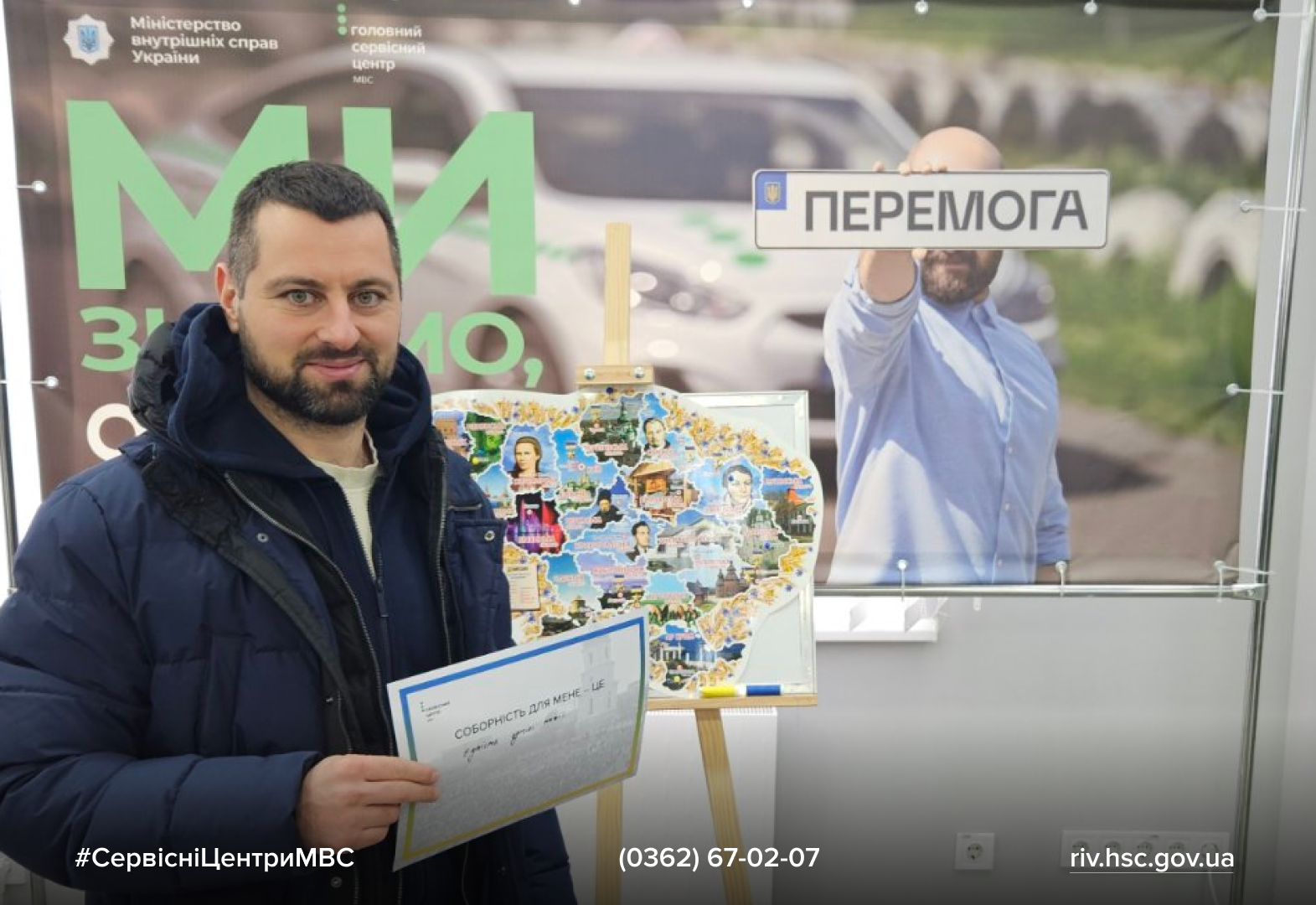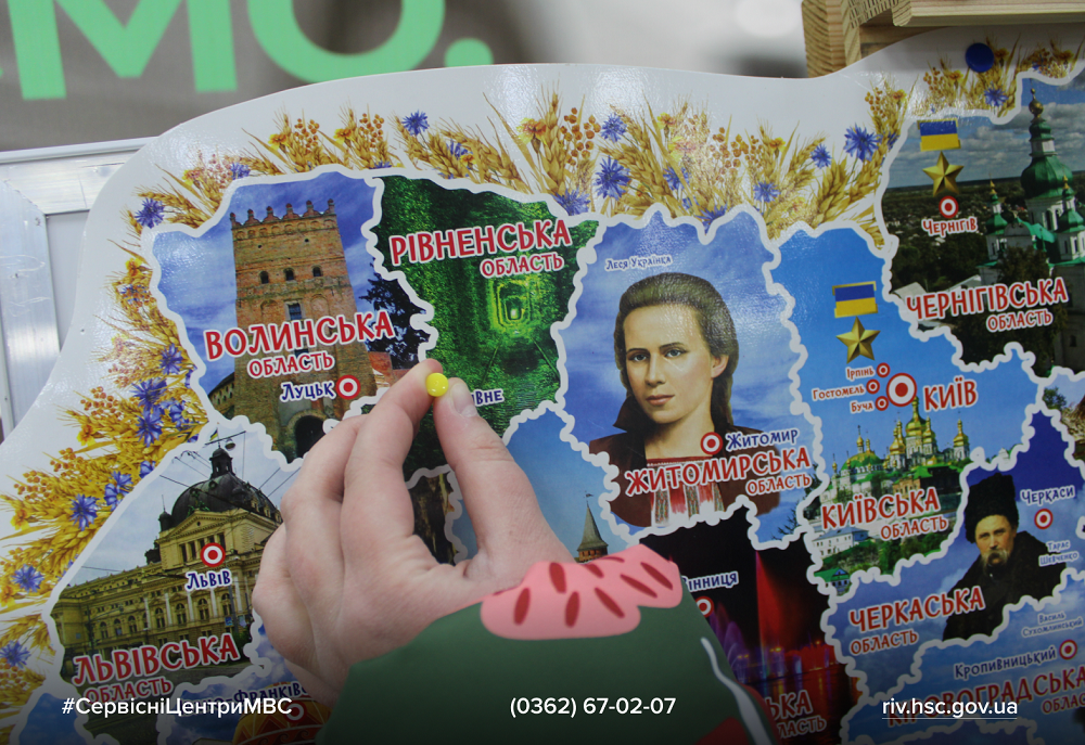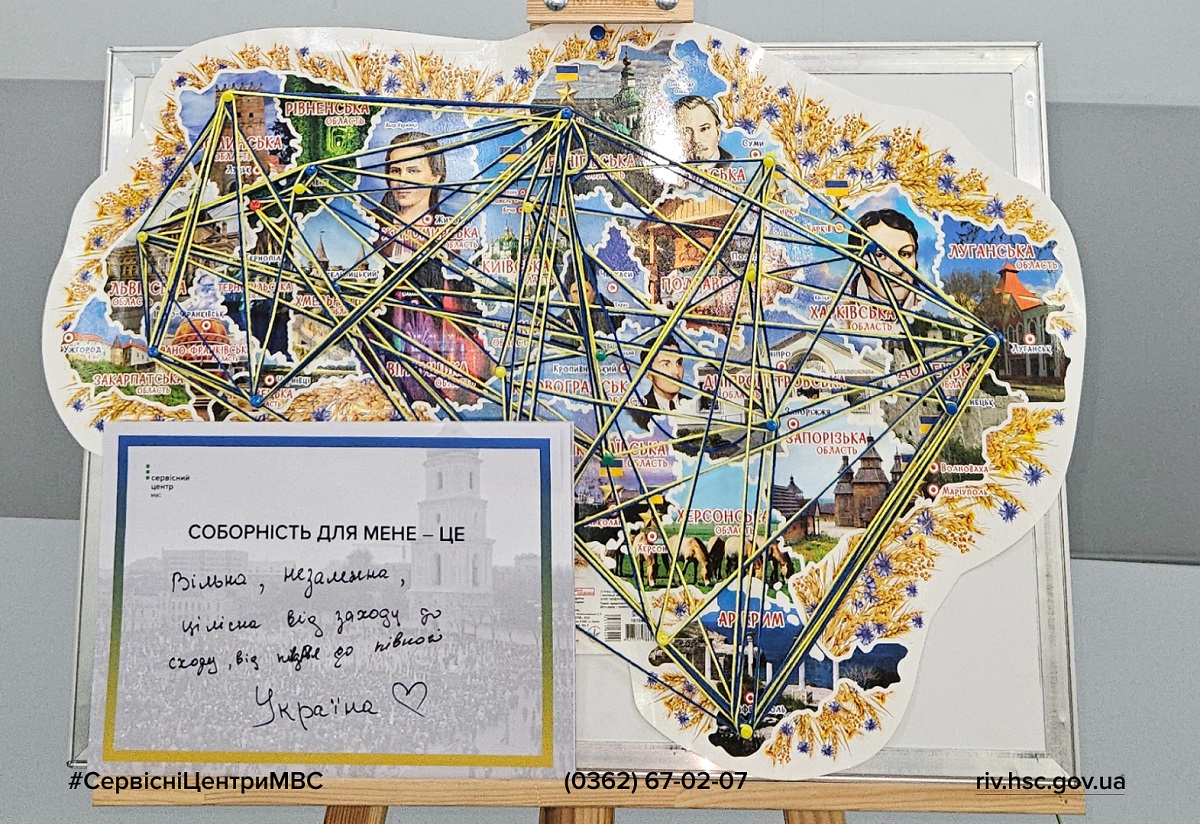 У сервісних центрах МВС Рівненщини, Волині та Житомирщини відбулися тематичні заходи, покликані ще раз наголосити: українська земля є неподільною, а люди, які на ній живуть, мають спільне бачення майбутнього — вільного, незалежного та суверенного. Відвідувачам пропонували на мапі України закріпити кнопку в області, звідки вони родом. Усі позначки з’єднувалися тонкою синьо-жовтою ниткою — як символ нерозривного зв’язку між регіонами та людьми, незалежно від відстаней.