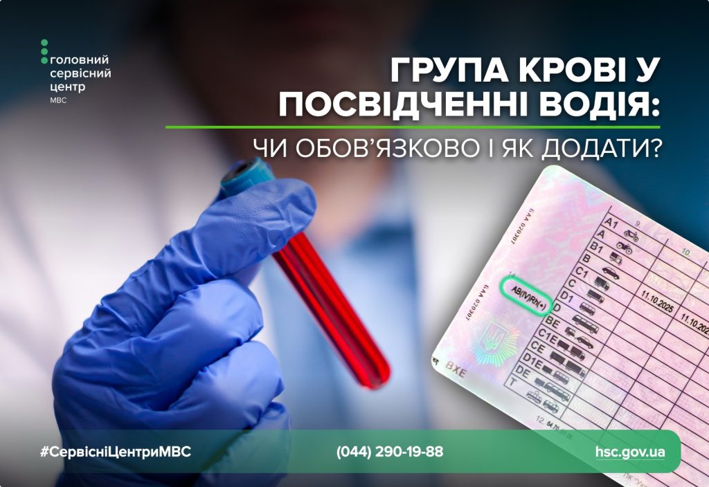 В Україні з 2019 року передбачено, що нові бланки водійського посвідчення повинні містити групу крові та резус‑фактор водія – як додаткову інформацію для швидкої медичної допомоги потерпілим у ДТП. Проте на практиці далеко не всі посвідчення водія, особливо після обміну чи відновленні, містять ці дані. Група крові вноситься у посвідчення водія не зі слів водія, а за даними медичної довідки, яка в обов’язковому порядку надається при складанні іспитів в сервісних центрах МВС. В інших випадках вона є бажаною, але не обов’язковою під час дії воєнного стану. Чому група крові не завжди переноситься при обміні або відновленні посвідчення водія Немає підтвердження в медичній довідці Щоб інформація про групу крові потрапила в посвідчення водія, вона має бути зазначена в медичній довідці. Якщо під час обміну водієм не надається дійсна медична довідка або в документі відсутня інформація про групу крові, то сервісний центр МВС не матиме підстав для перенесення таких даних. Необов’язковий характер інформації Запис групи крові (та резус‑фактора) – наразі не обов’язкова інформація. У новому зразку посвідчення вона вказується лише за згодою особи. Тобто якщо власник не дає такої згоди або не надає довідку з цих даних – у посвідченні ця графа може бути порожньою. Обмін посвідчення водія у період воєнного стану За умов воєнного стану, деякі процедури спрощені або адаптовані, зокрема медичні перевірки можуть бути частково «відтерміновані». У такій ситуації довідка про групу крові може не бути обов’язковою для обміну документів. Наприклад, наразі в Україні при обміні водійського посвідчення медична довідка не вимагається через умови воєнного стану. Таким чином, інформація про групу крові автоматично не переноситься в нове посвідчення, якщо вхідні дані (медична довідка або письмова згода) не були представлені. Що робити, якщо потрібна група крові в посвідченні водія Особисто звернутися до сервісного центру МВС: при подачі документів на обмін чи відновлення можна вказати, що є бажання, аби в новому посвідченні була зазначена група крові. Подати відповідну медичну довідку, де буде вказана група крові . Дати письмову згоду на внесення цієї інформації (як передбачено правилами внесення групи крові в новий бланк). У такому випадку адміністратор сервісного центру МВС зможе внести дані з медичної довідки до нового посвідчення.  Важливо: інформація про групу крові не є обов’язковою Зазначення групи крові в посвідченні водія може бути корисним, але це не обов’язковий запис. Тобто відсутність цього запису не впливає на законність права керування транспортним засобом. Також, якщо посвідчення водія було видане до введення нових бланків, то воно залишається чинним на весь строк дії – обмін через це робити не вимагається. Консультацію щодо послуг сервісних центрів МВС можна отримати за телефоном (044) 290-19-88 або на сторінках Головного сервісного центру МВС в Фейсбук та Інстаграм. Відповіді на найпоширеніші питання та корисну інформацію черпайте на сайті.